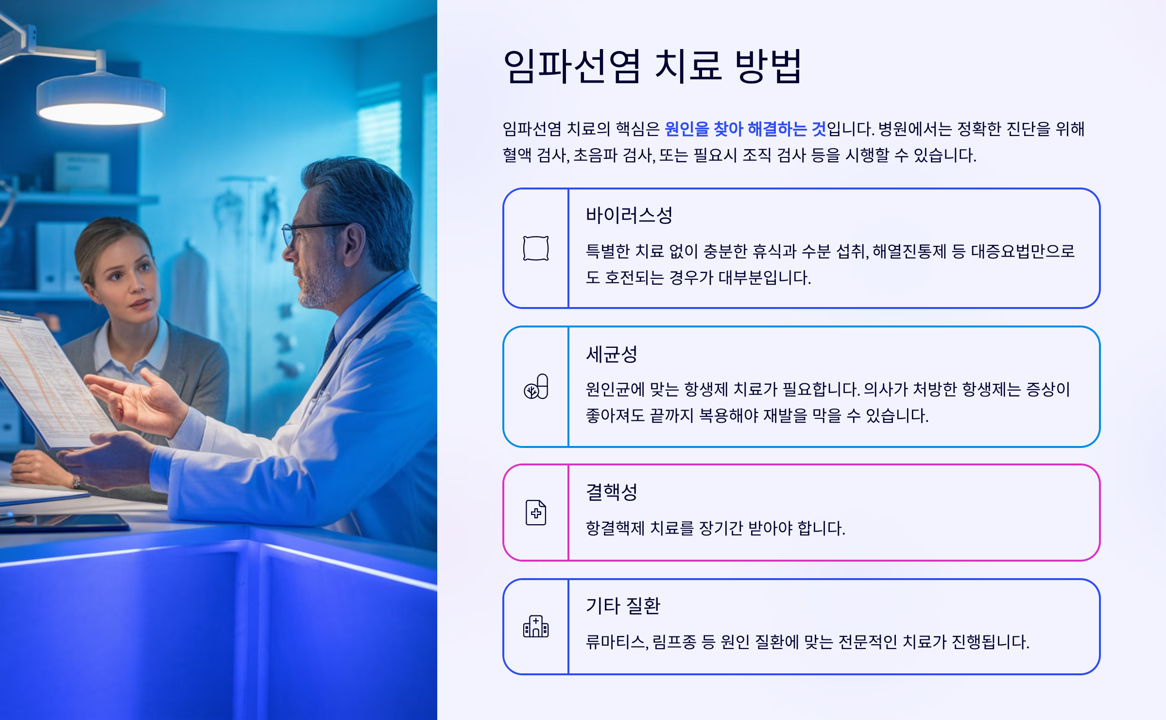 임파선염 치료의 핵심은 '원인'을 찾아 해결하는 것입니다. 따라서 병원에서는 정확한 진단을 위해 혈액 검사, 초음파 검사, 또는 필요시 조직 검사 등을 시행할 수 있습니다.