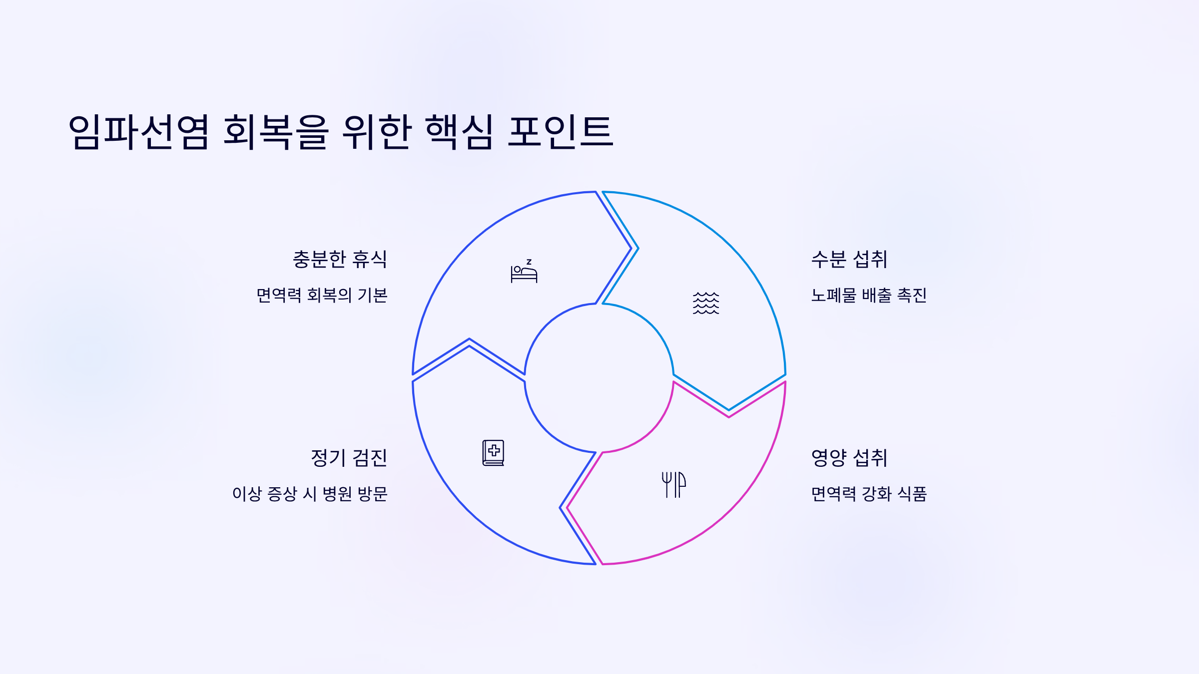 - 휴식: 면역력이 회복될 수 있도록 충분히 쉬는 것이 가장 중요합니다.