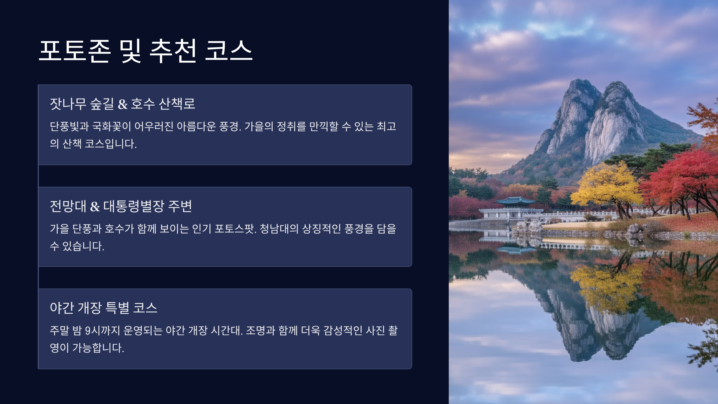 - 전망대와 대통령별장 주변은 가을 단풍과 호수가 함께 보이는 포토스팟으로 인기가 많아요.