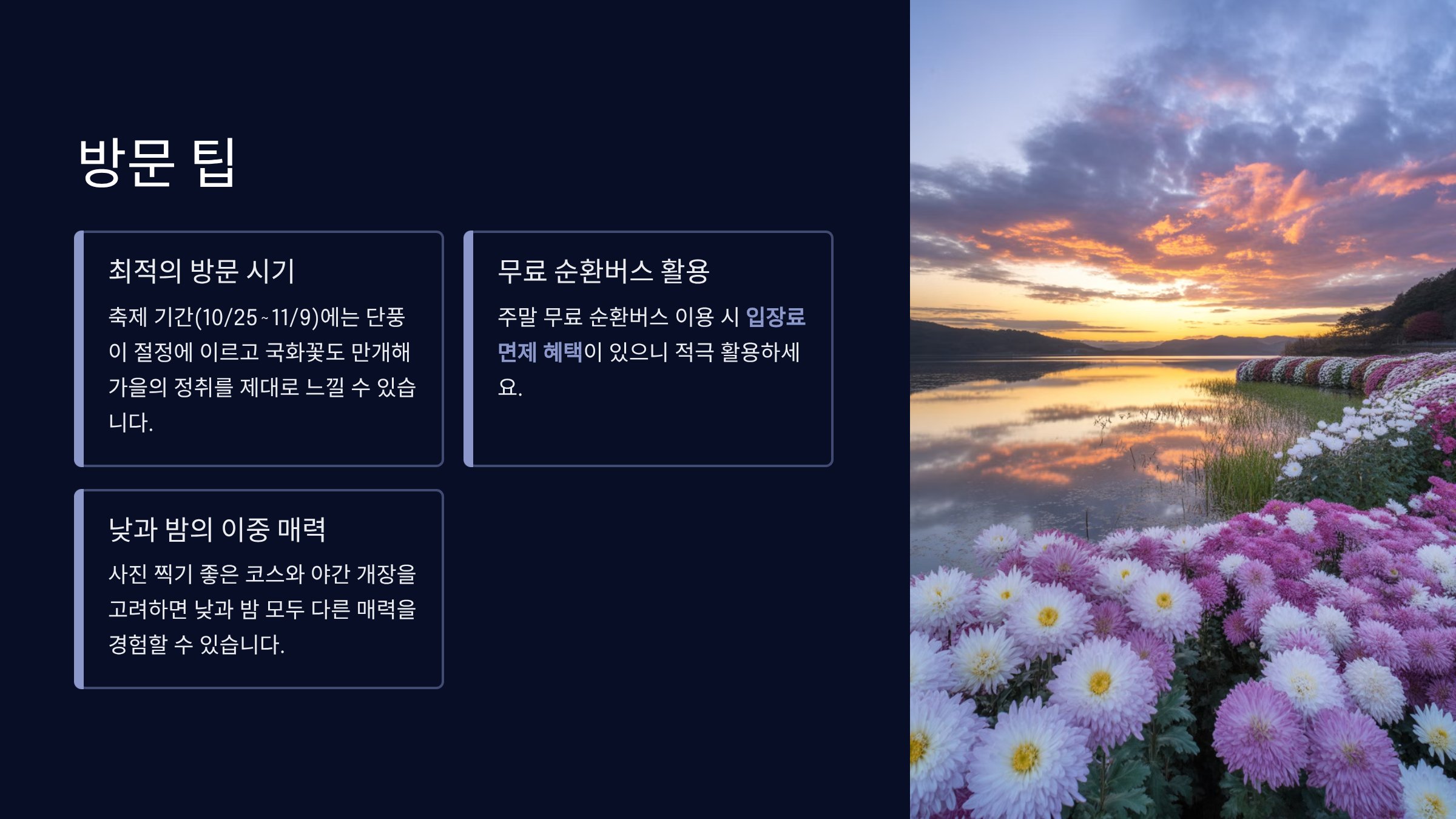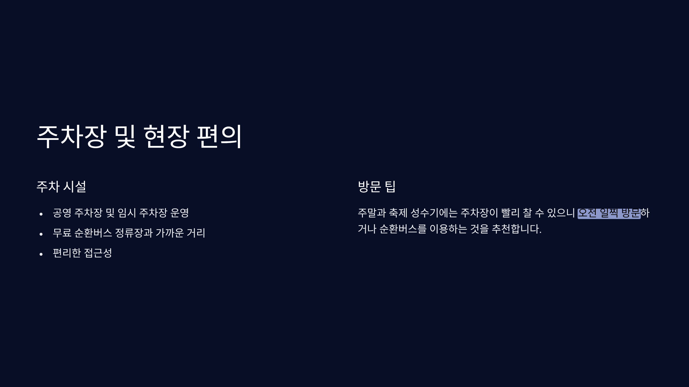 - 특히 주말이나 축제 성수기에는 주차장이 빨리 찰 수 있으니 오전 일찍 방문하거나 순환버스를 이용하는 것이 좋습니다.