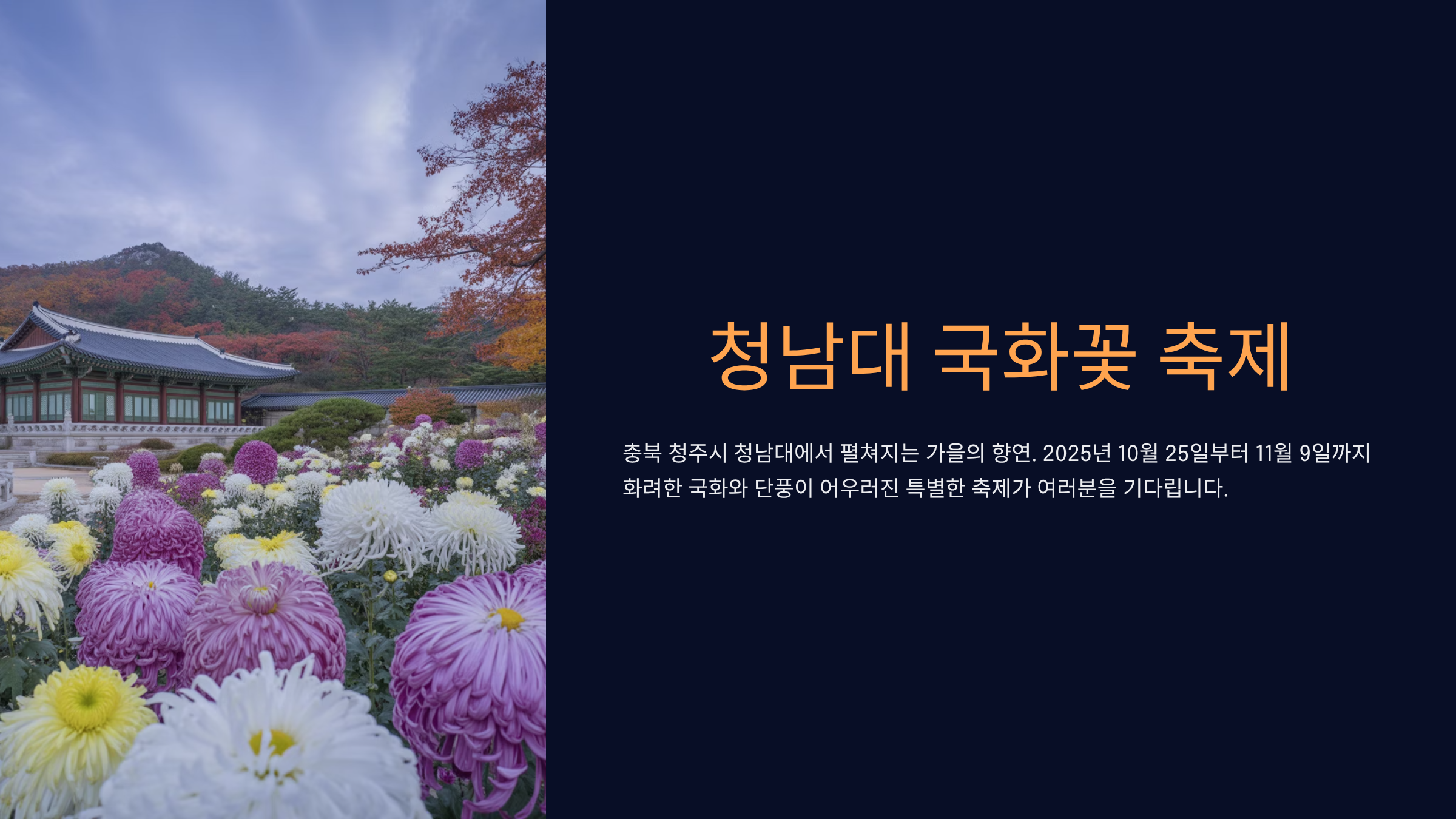 가을의 깊이가 더해지는 계절, 충북 청주시 문의면에 위치한 청남대에서는 매년 화려한 국화꽃과 단풍이 어우러진 가을 축제가 열려요.