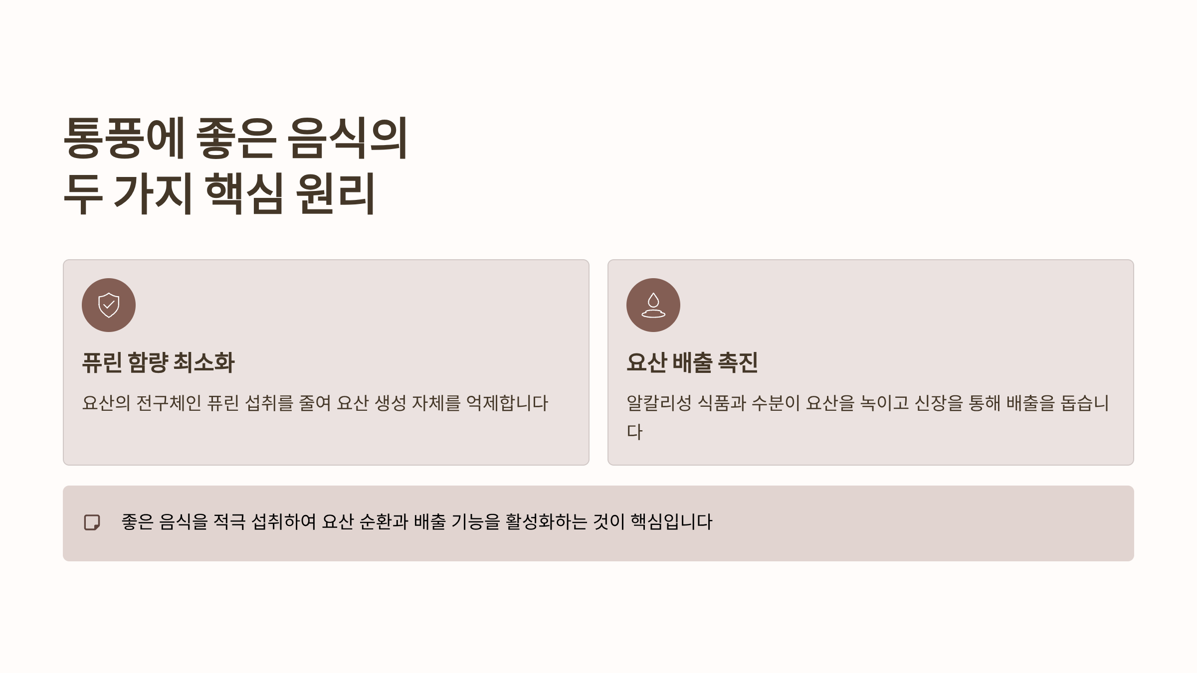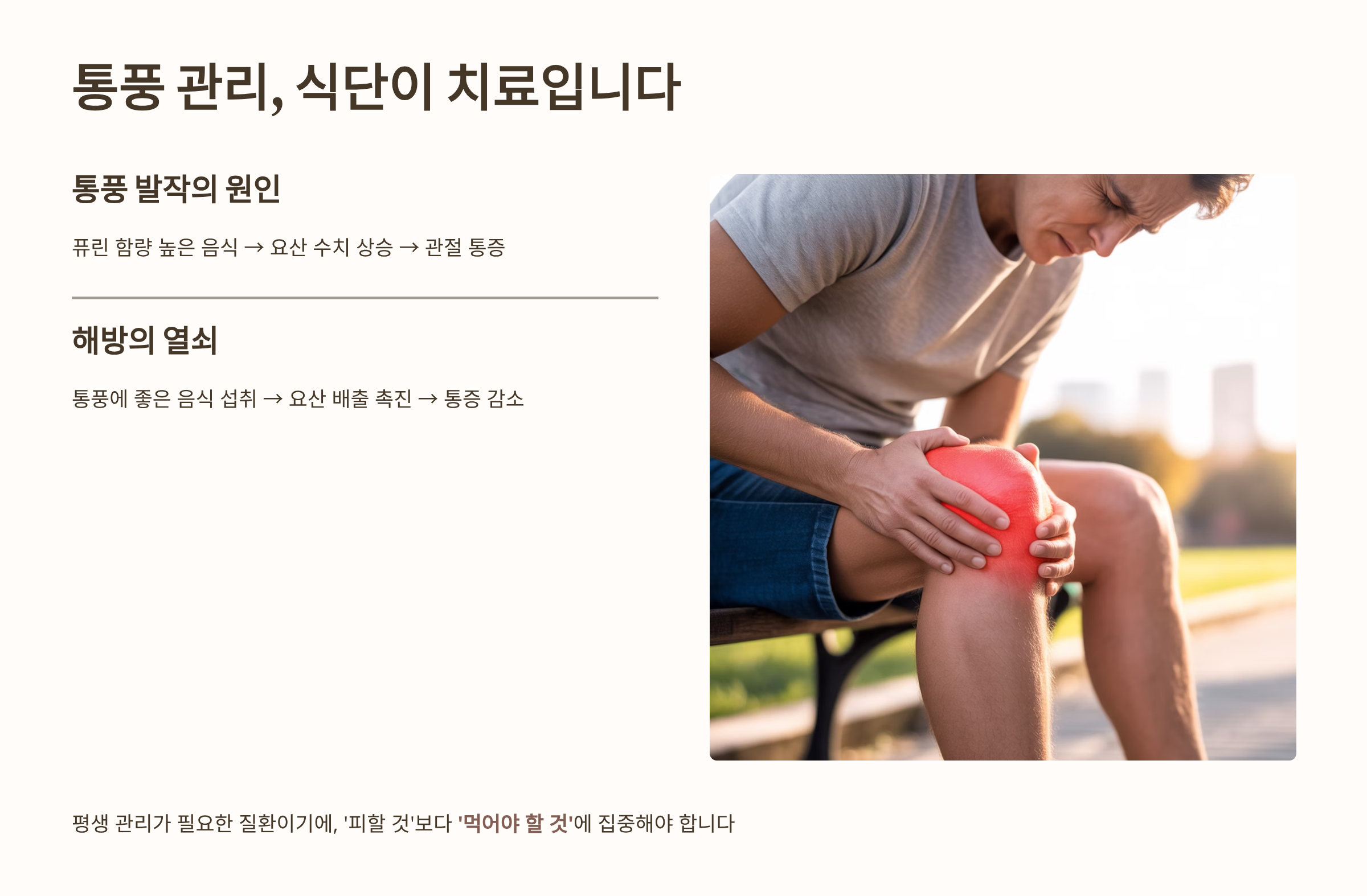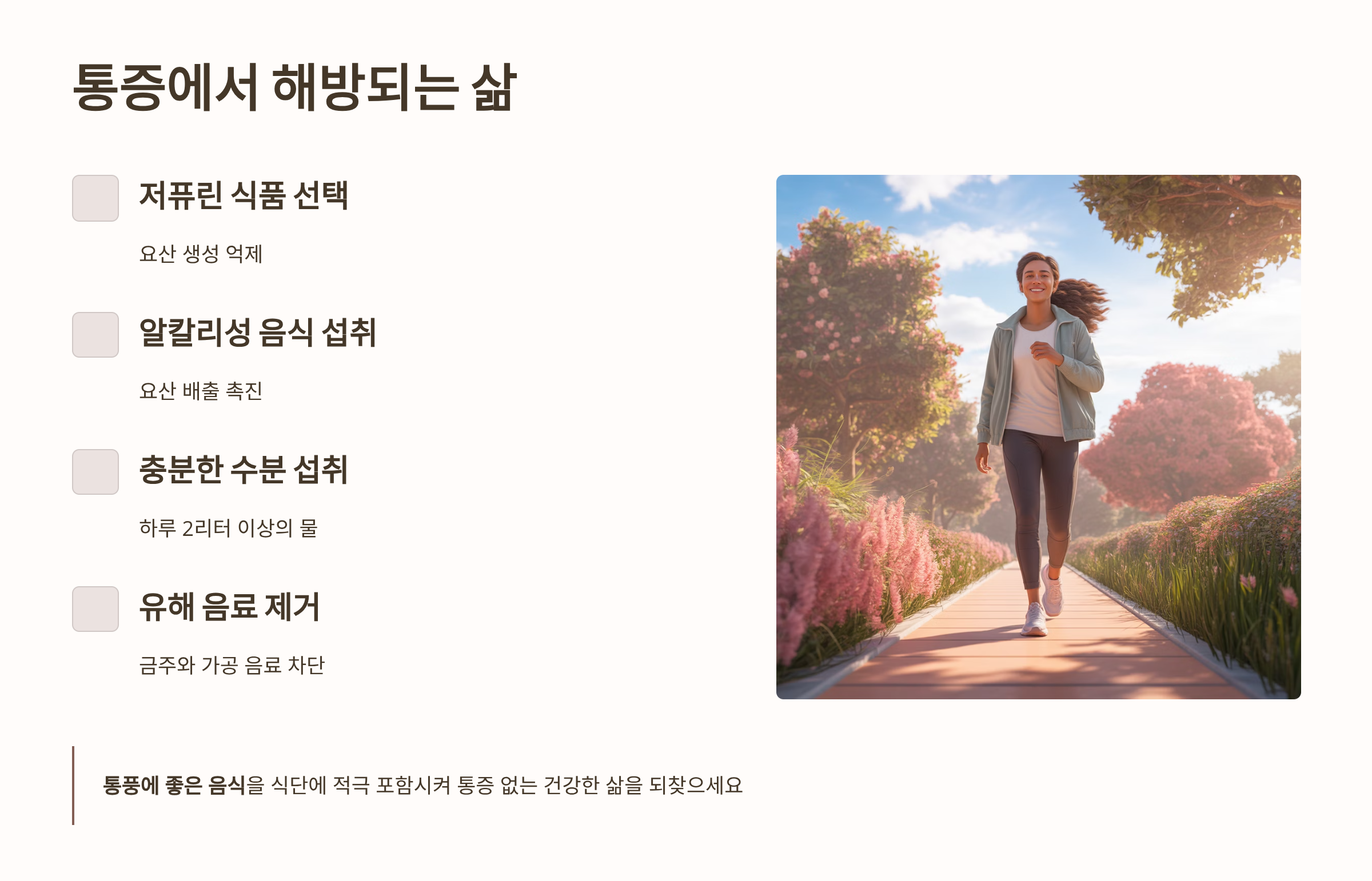 통풍 관리는 단순히 '안 좋은 것'을 피하는 것을 넘어, '좋은 것'을 적극적으로 섭취하여 요산의 순환과 배출 기능을 활성화하는 것이 핵심입니다.