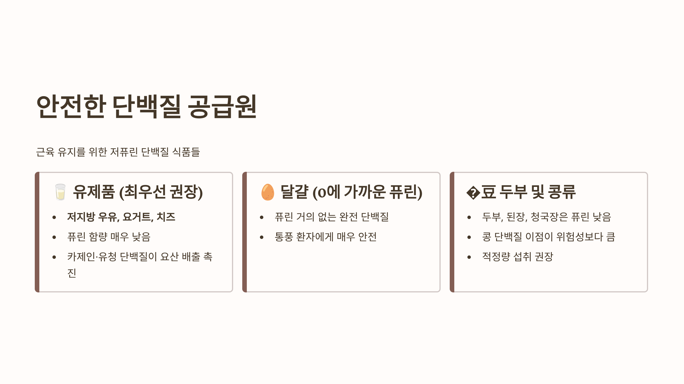 통풍 환자도 단백질 섭취를 통해 근육을 유지해야 하지만, 육류의 퓨린 함량 때문에 어려움을 겪습니다. 다음은 퓨린 함량이 낮아 통풍에 좋은 안전한 단백질 공급원입니다.