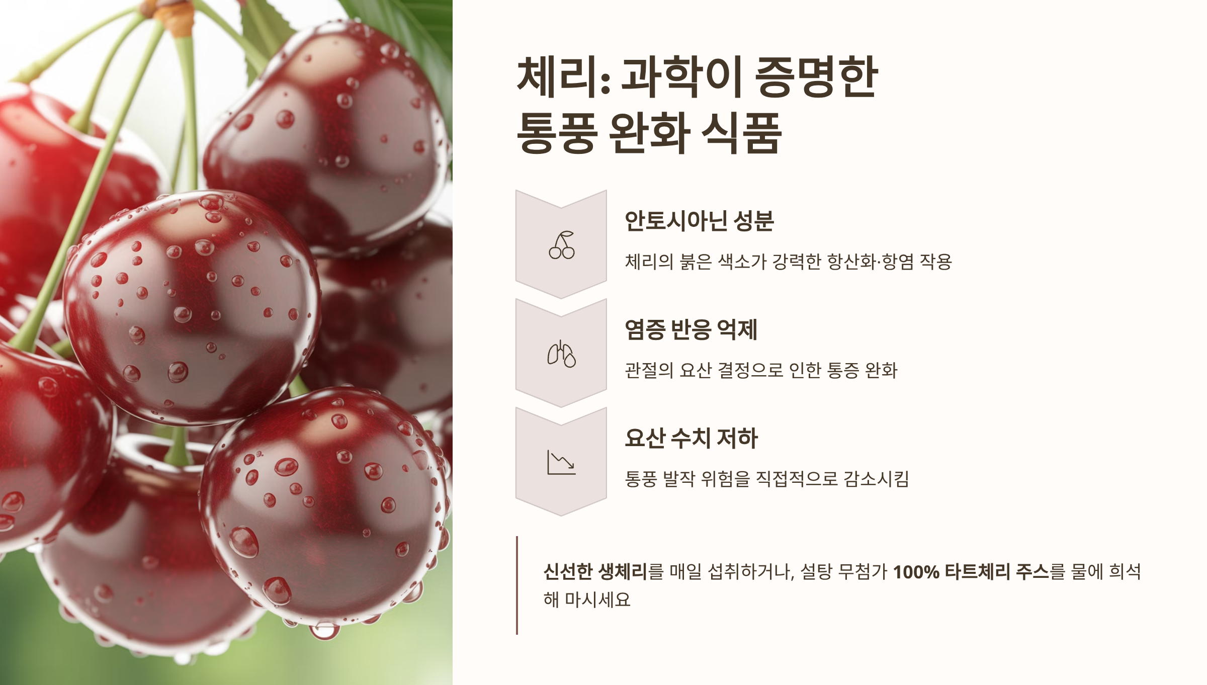 - 안토시아닌의 작용: 체리의 붉은색을 내는 성분인 **안토시아닌(Anthocyanin)**은 강력한 항산화 및 항염 작용을 합니다. 이 성분은 관절에 쌓인 요산 결정으로 인해 발생하는 염증 반응을 억제하여 통증을 완화하는 효과가 있습니다.