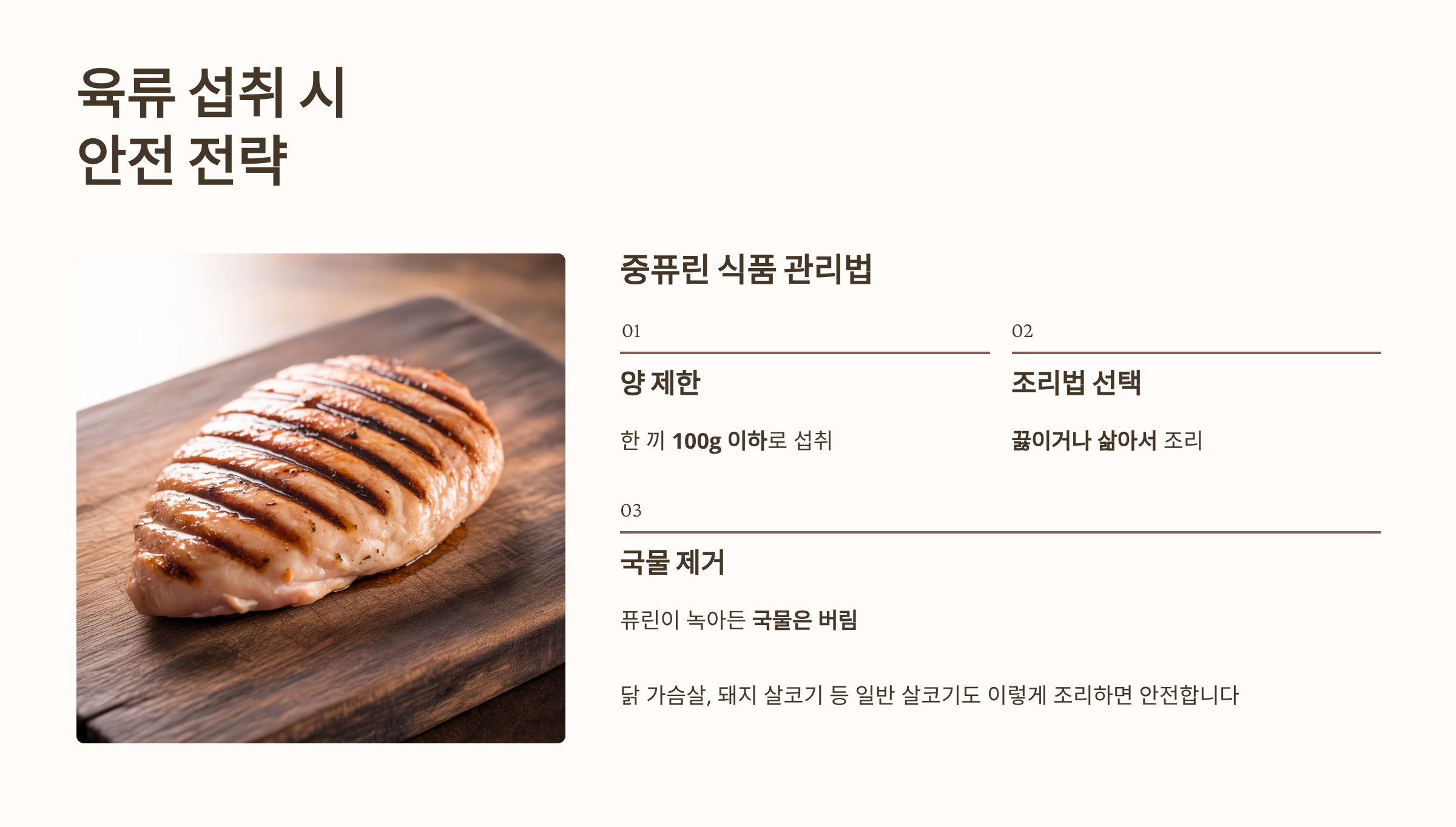 - 육류 섭취 전략: 일반적인 살코기(닭 가슴살, 돼지 살코기)는 중퓨린 식품이므로, 한 끼에 100g 이하로 제한하고, 끓이거나 삶아서 국물을 버린 후 섭취하는 것이 좋습니다.