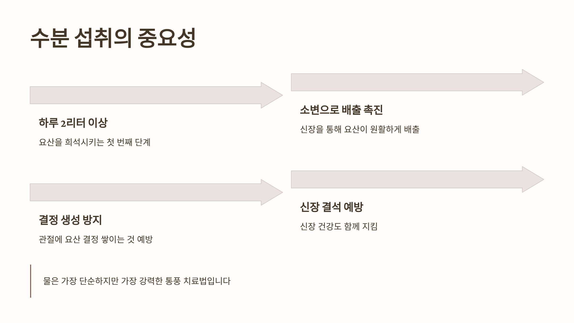 통풍에 좋은 음식을 아무리 먹어도, 이 모든 성분을 운반하고 요산을 배출시키는 최종 관문은 물입니다.