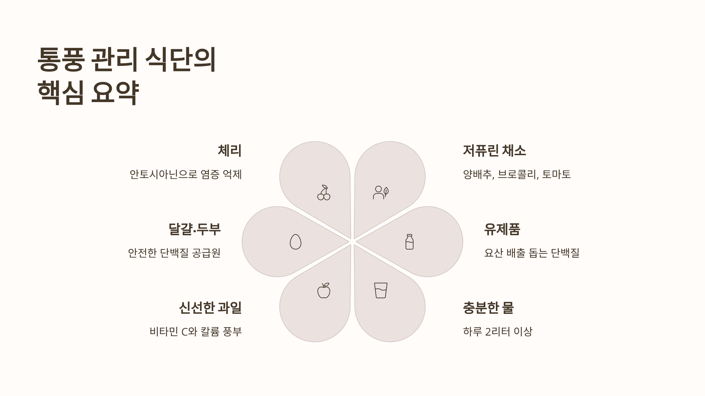 통풍에 좋은 음식은 요산 배출을 돕고 염증을 억제하는 저퓨린, 고수분, 알칼리성 식품들입니다. 특히 체리의 안토시아닌은 요산 수치 저하와 통증 완화에 과학적 효과가 있으며, 저지방 우유, 두부, 달걀은 안전한 단백질 공급원입니다. 가장 중요한 것은 하루 2리터 이상의 물을 마시는 습관을 들이고, 맥주나 액상과당 음료를 철저히 피하는 것입니다. 통풍에 좋은 음식을 식단에 적극적으로 포함시켜 통증에서 해방되고 건강한 삶을 되찾으시기를 바랍니다.
