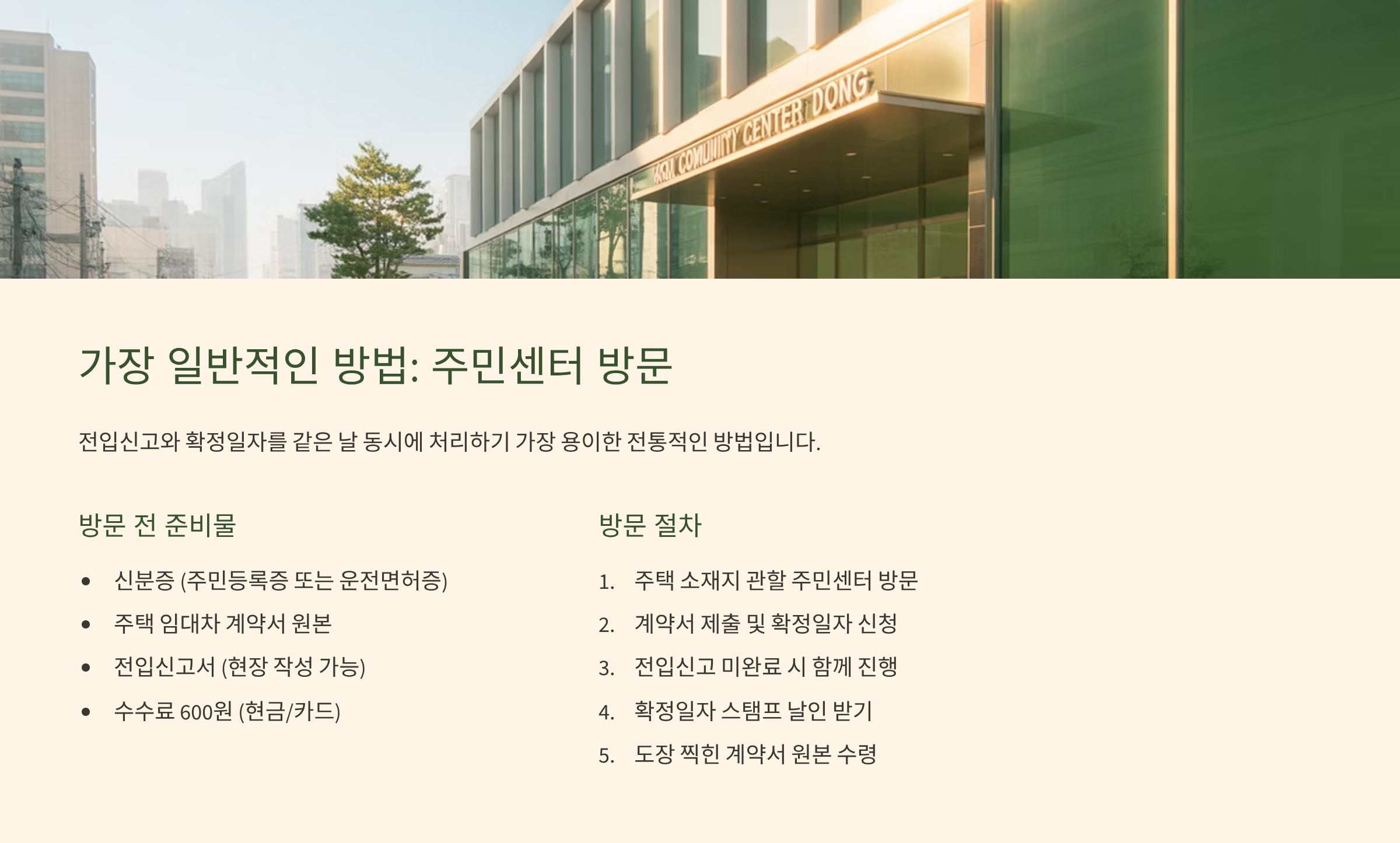 가장 전통적이고 일반적인 방법은 주택 소재지의 관할 주민센터(행정복지센터)를 직접 방문하는 것입니다. 특히 전입신고와 확정일자를 같은 날 동시에 처리하기에 가장 용이합니다.