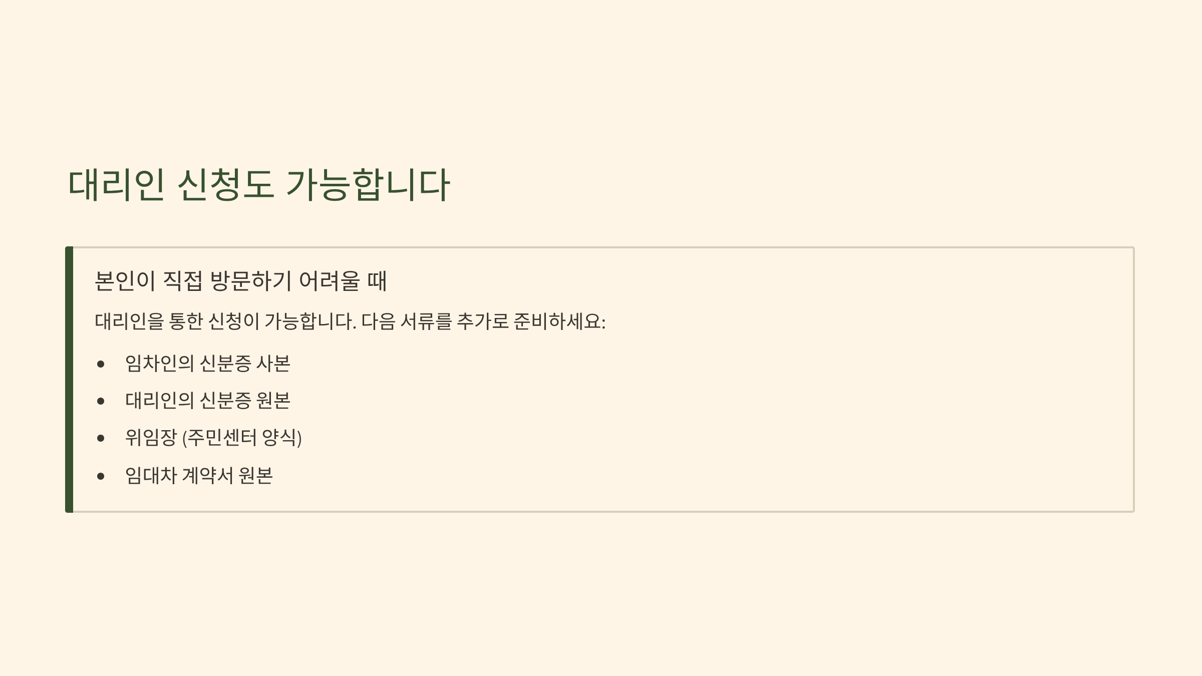 대리인 신청 시: 임차인의 신분증, 임대차 계약서 원본 외에 대리인의 신분증과 위임장이 추가로 필요합니다.