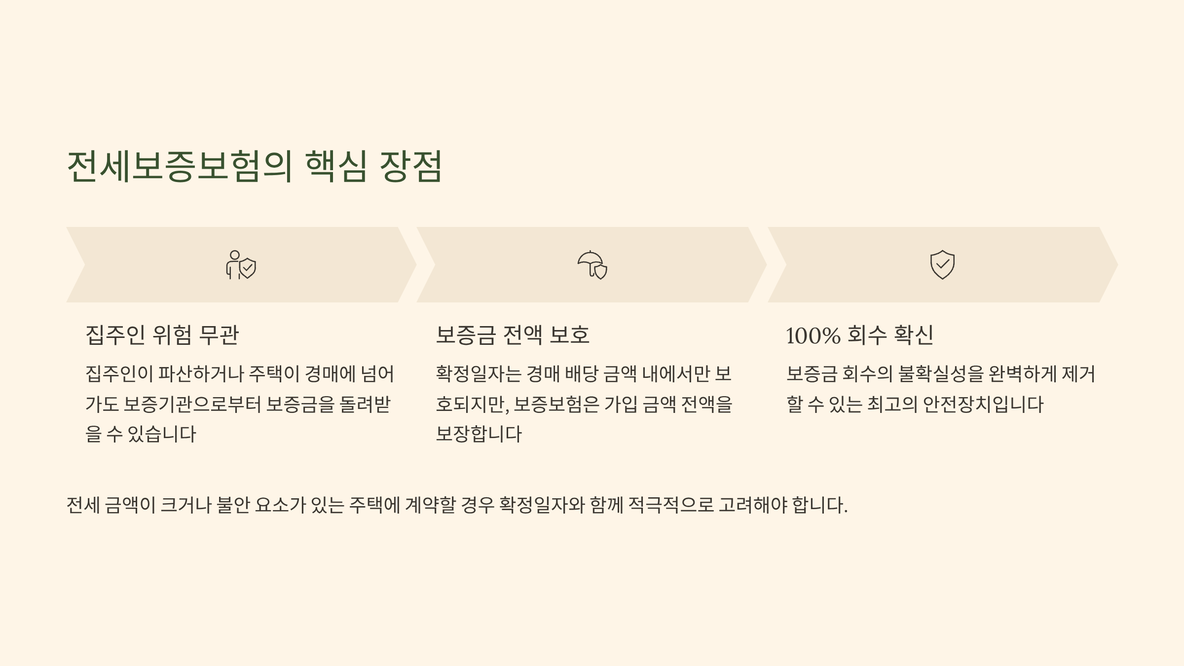 - 집주인의 위험과 무관: 집주인이 파산하거나 주택이 경매에 넘어가더라도, 세입자는 보증기관으로부터 떼일 염려 없이 보증금을 돌려받을 수 있습니다. 보증기관이 먼저 세입자에게 돈을 주고, 나중에 집주인에게 구상권을 청구하는 방식입니다.