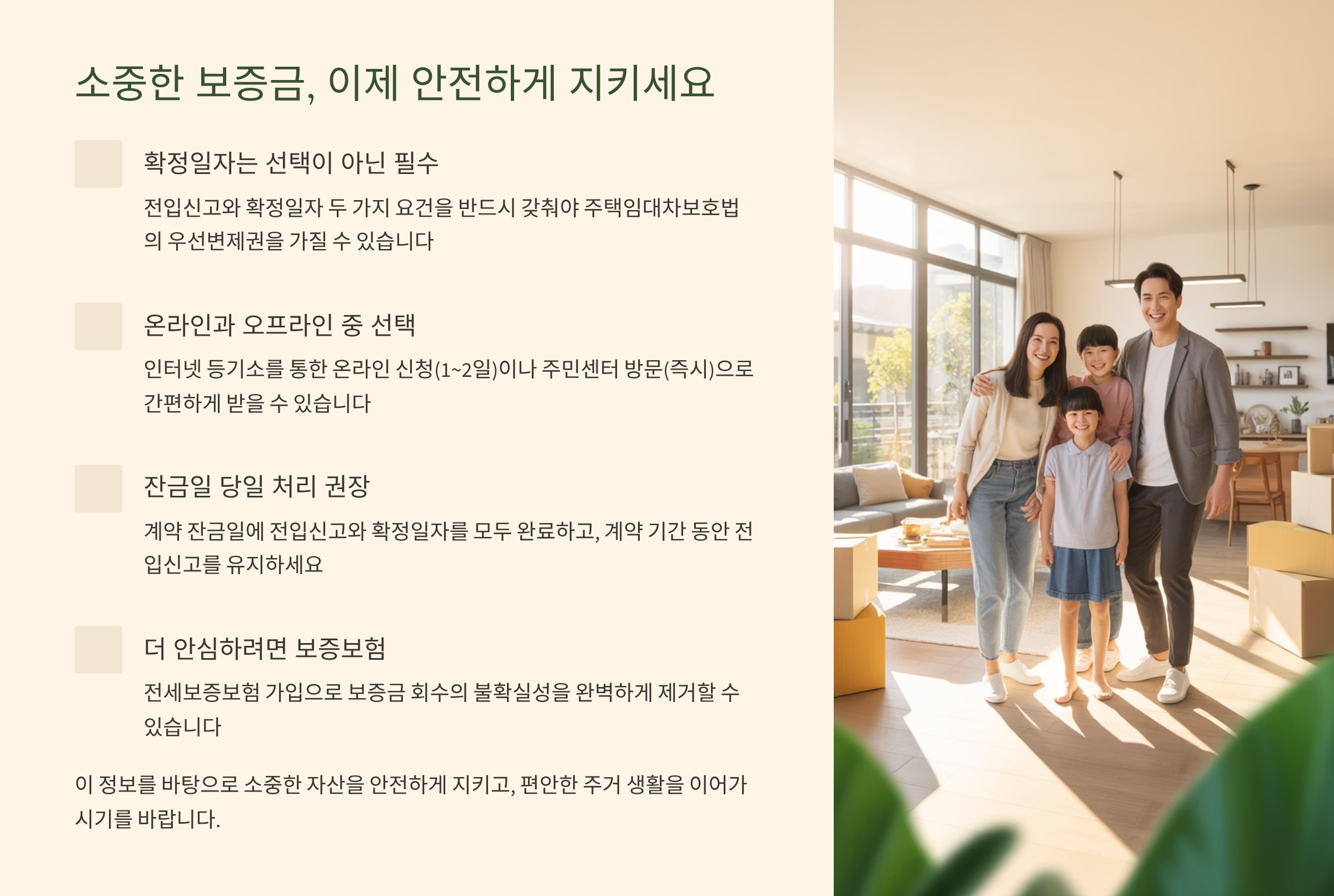 주택 임대차 계약에서 확정일자는 단순히 하나의 행정 절차가 아니라, 세입자의 소중한 보증금을 지켜주는 법적 안전핀입니다. 전입신고와 확정일자라는 두 가지 요건을 반드시 갖춰야만, 주택임대차보호법이 부여하는 우선변제권이라는 강력한 방패를 가질 수 있습니다.