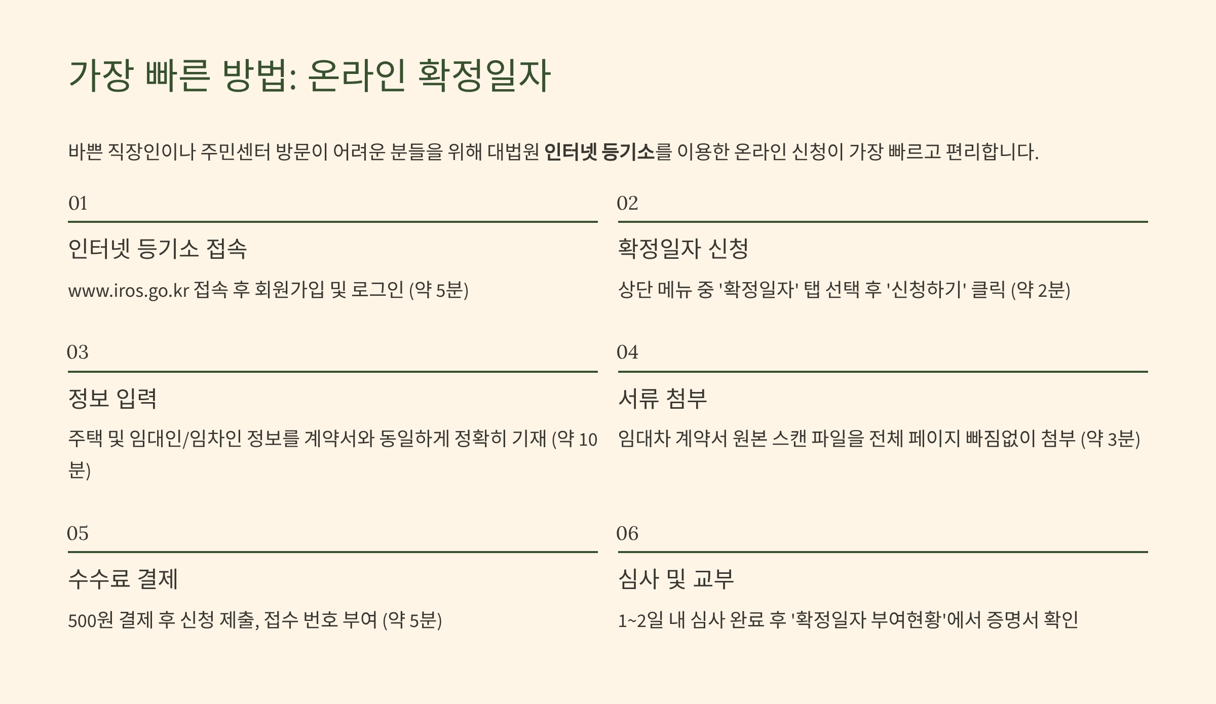 바쁜 직장인이나 주민센터 방문이 어려운 분들을 위해 대법원 인터넷 등기소를 이용한 온라인 확정일자 신청 방법은 가장 빠르고 편리한 대안입니다.